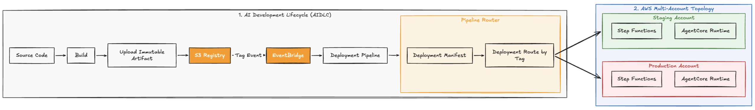 The AIDLC acts as the control plane for your deployments. We built this after watching too many agent deployments fail in production because a developer manually tweaked a configuration in the AWS console. It abandons fragile, CLI-driven deployments in favor of an event-driven, declarative architecture.